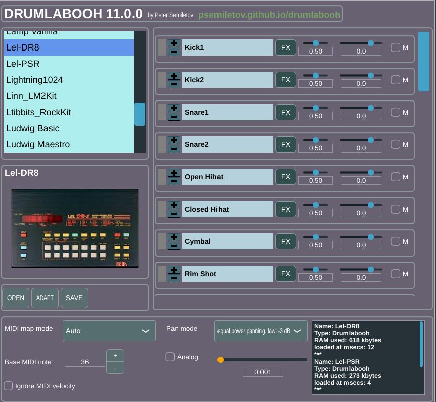 Features* DAW Compatibility* Linux LV2/VST3i, Windows VST3i plugin format * Supported sample drumkit formats: Drumlabooh, Hydrogen, SFZ, and simple directories with samples * Bundled with high quality drumkits designed after legendary acoustic drums and drum machines * Stereo (with built-in mixer) or multi (36 channels) output * Built-in mixer with Pan, Volume, mute controls and Pan mode option * FX for each instrument slot: LP, HP resonance filters and Analog knob to make the sound warmer (per-instrument or/and for the whole mix) * Up to 36 instrument slots with layers (max 127 layers) * Layer change by MIDI velocity, Round Robin or Random order * Multi single-shot samples per slot * Automatic open hihat mute on hihat close * Kit-defined (user-defined) mute groups * Drumkit image (if provided) at plugin window * Flexible MIDI mapping modes * Written in C++, based on JUCE toolkit Some historyDrumlabooh was written as a replacement for Drumrox, my fork of DrMr (see Nicklan’s DrMr and Filipe Coelho’s fork).DrMr is a cool C/GTK+2 LV2 plugin that I used for years, but then it stopped supporting the current Hydrogen drumkit format. At first, I "fixed" the kit XML files manually, and at some point I made a fork of DrMr called Drumrox and fixed Hydrogen kit format reader at the XML parsing level. It was in the spring of 2023. C is not my favorite language, so I converted the codebase to C++ and wrote a new drumkit loader using the PugiXML parser. Soon SFZ and my own simple kit format were added. I also replaced the note on/off LEDs with clickable buttons and redesigned the window a bit, but I still didn’t feel comfortable with the old code - I didn’t understand some parts of it. I also found the LV2 documentation too obscure for me. Alas! After upgrading my PC, I noticed that Ardour could record MIDI events with some pre-delay (or negative shift). I read about this bug, and it didn’t seem fixable anytime soon. I would have been happy to use Drumrox in another DAW, Reaper, but DrMr’s UI was based on GTK2, and Reaper does not support GTK2 GUIs! I spent a lot of time experimenting with small toolkits that produce X-based GUIs, then (of course!) started to write my own one - but then I tried JUCE and... that’s how Drumlabooh was born! From Drumrox I took my drumkit loader code, ported it to JUCE, and used the resampler from Speex. After some time, I started adding new features... |